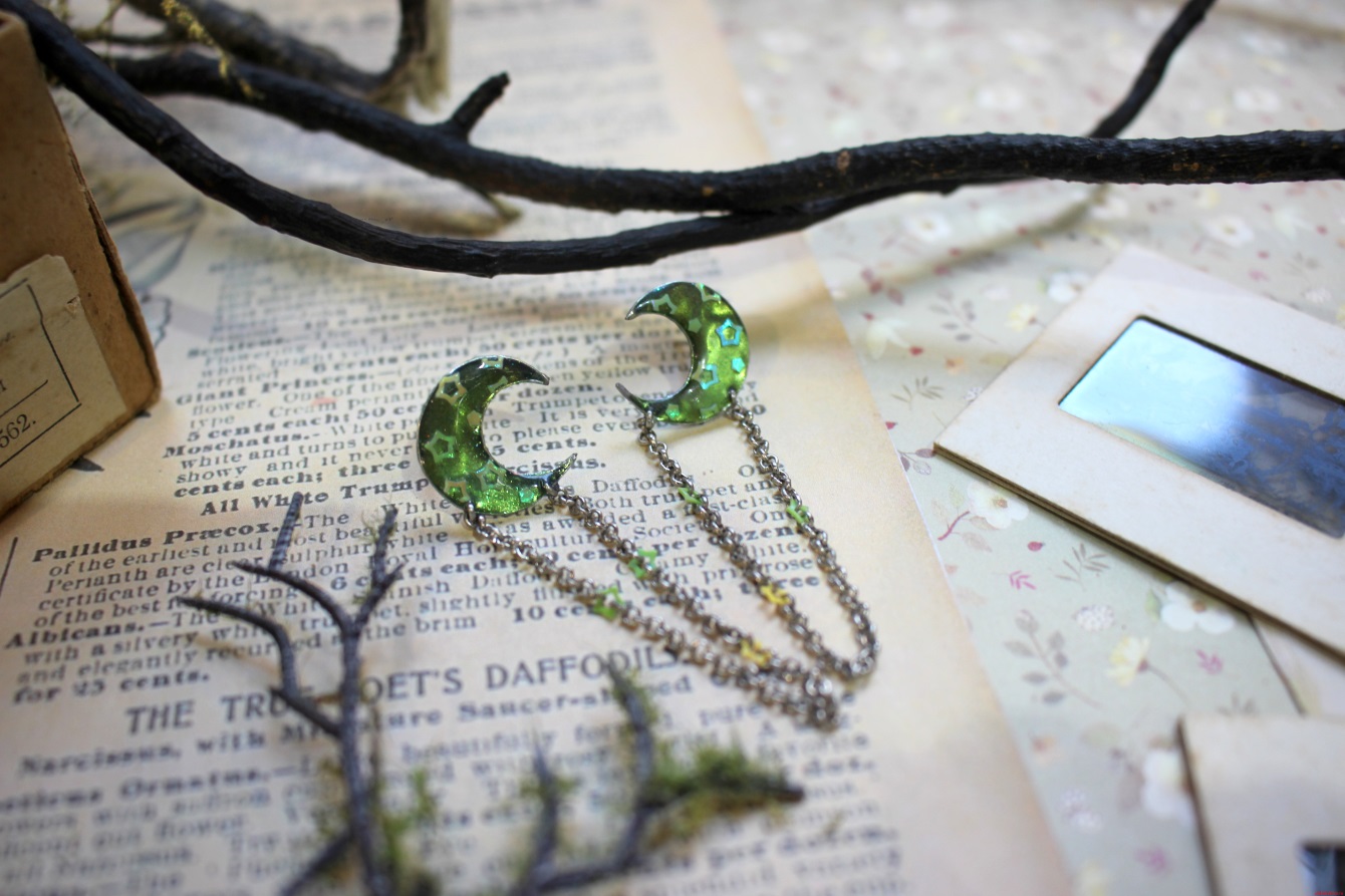 Серьги «Полумесяцы» с подвесками зелёные из витрали