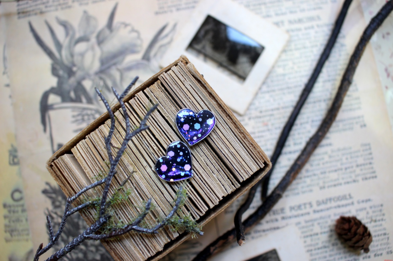 Серьги-гвоздики «Сердечко» синие с крупными блёстками из витрали