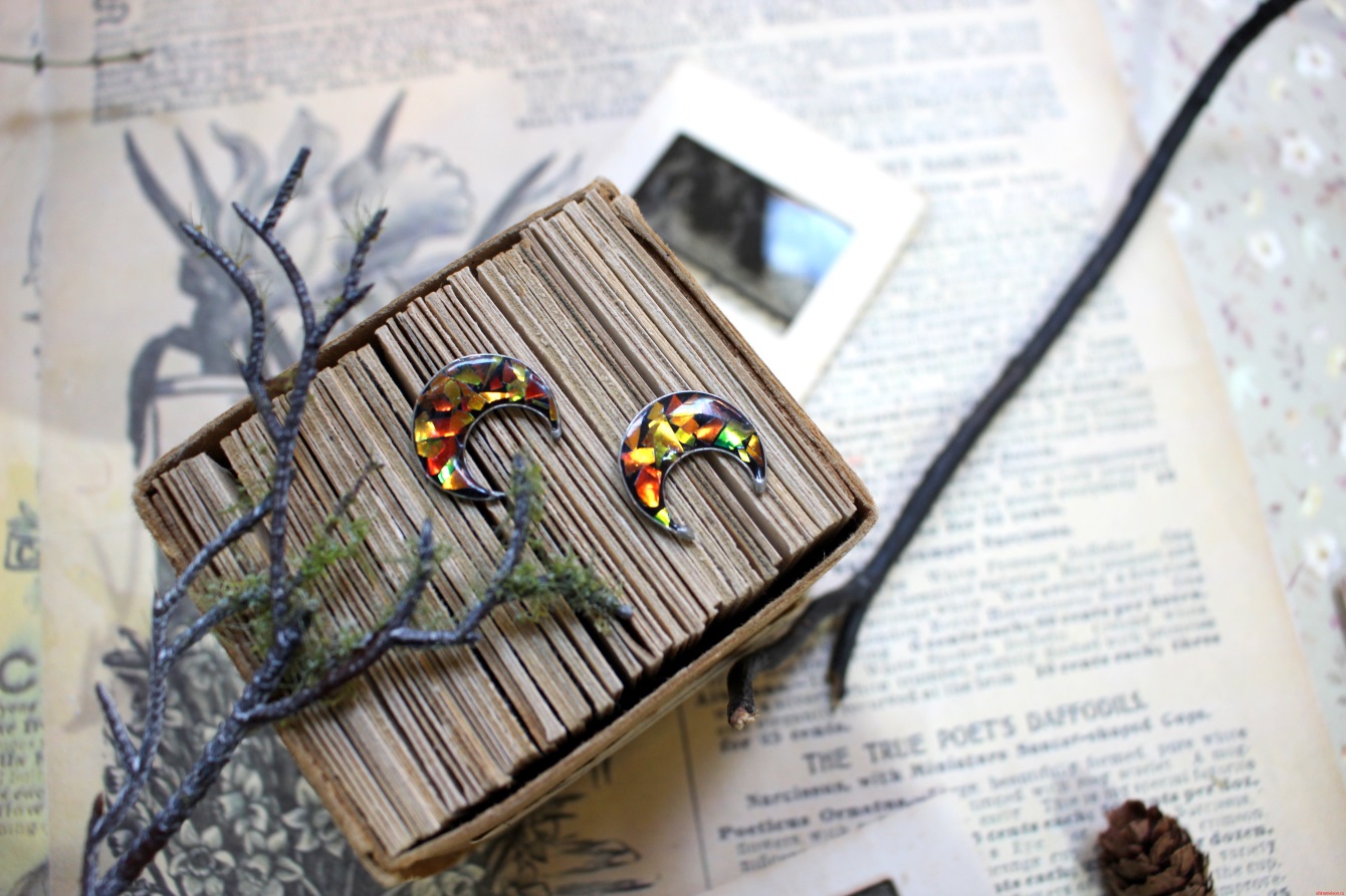 Серьги «Полумесяцы» абстракция оранжево-жёлтые с крупными блёстками из витрали