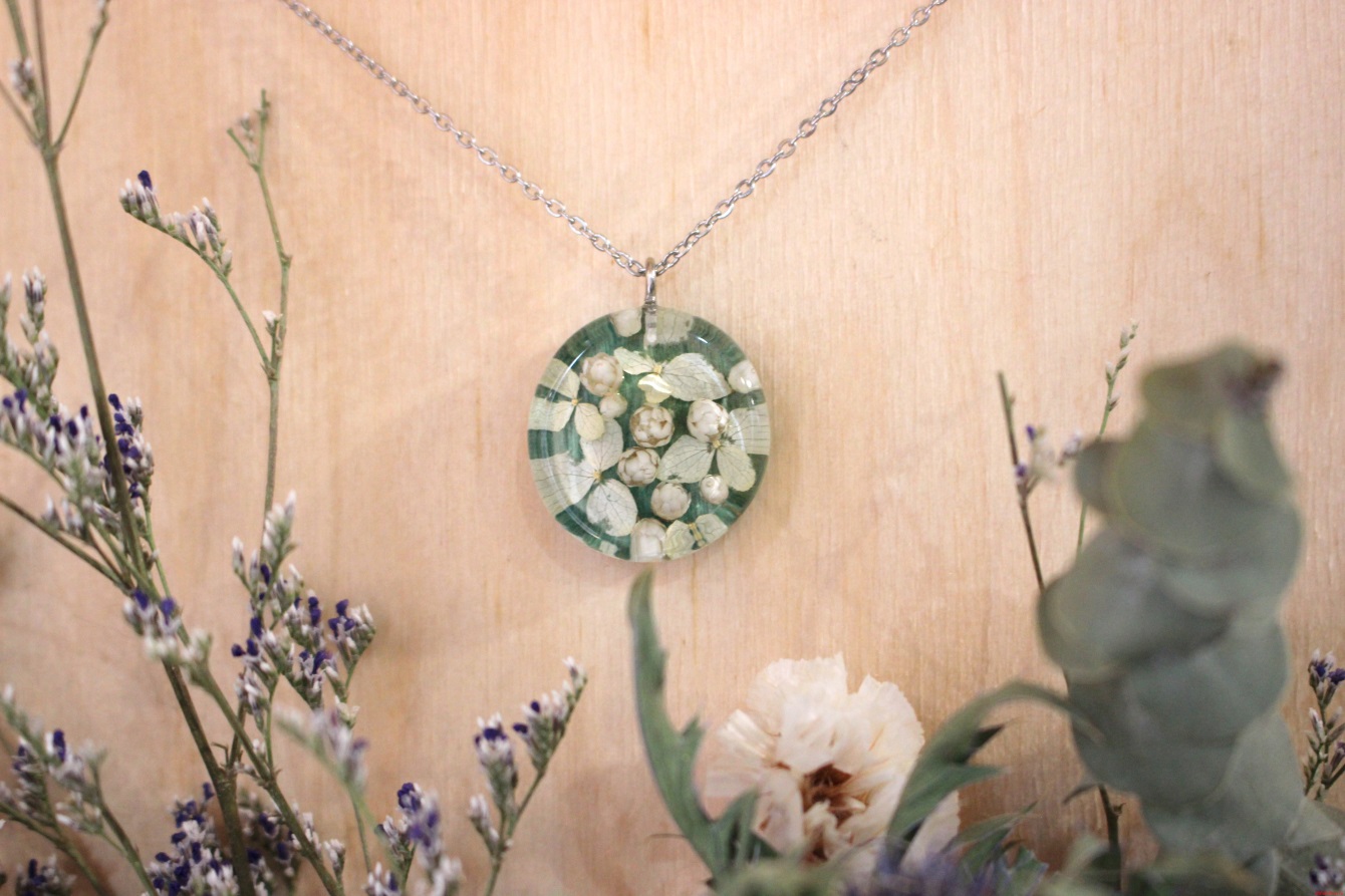 Кулон круглый «Цветочный с озотамнусом» зелёный на стаб. клёне