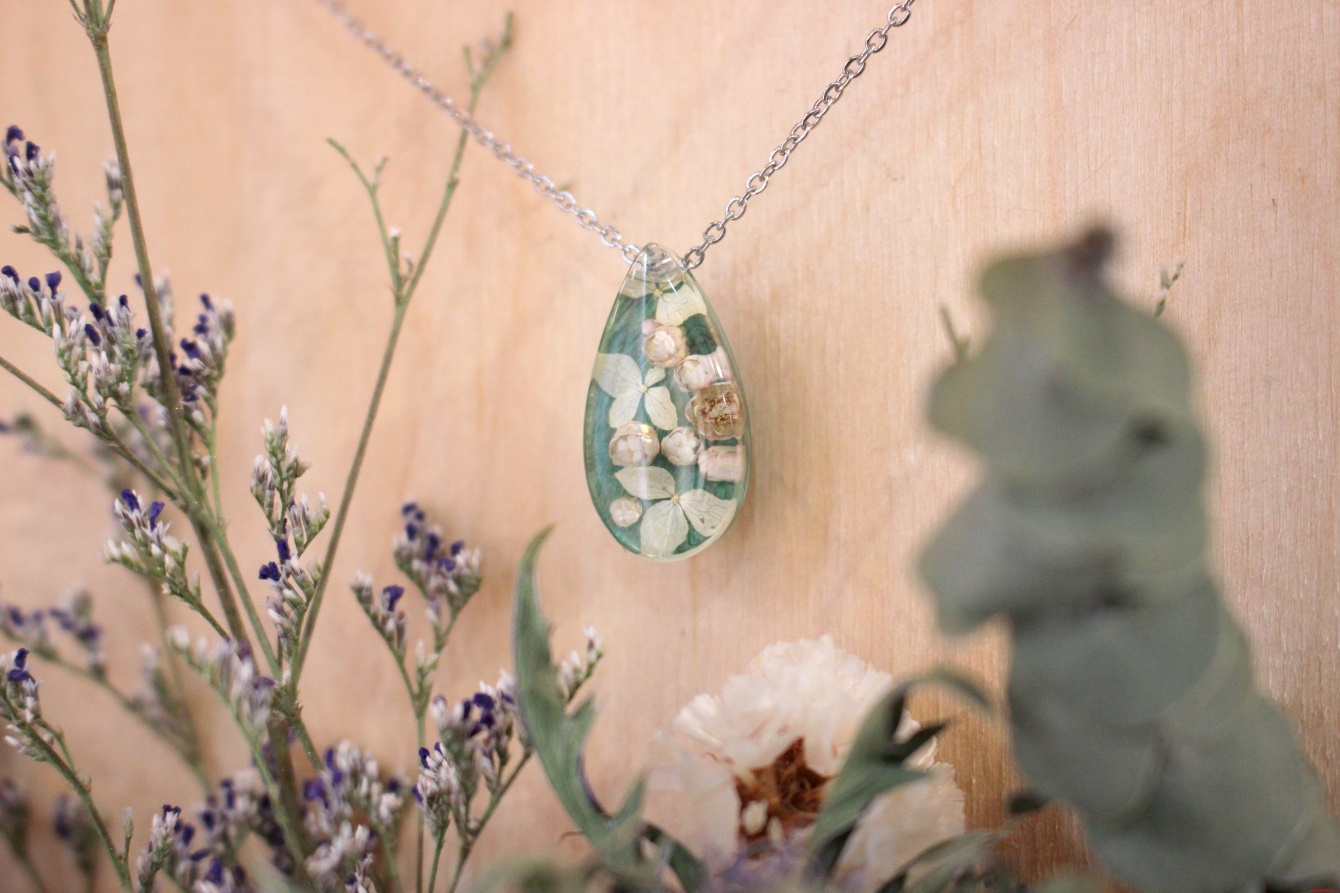 Кулон капля «Цветочный с озотамнусом» зелёный на стаб. клёне