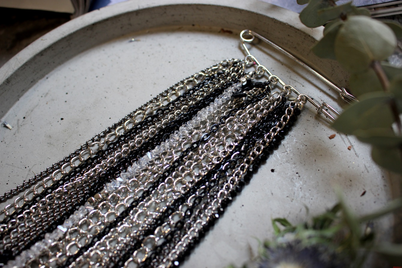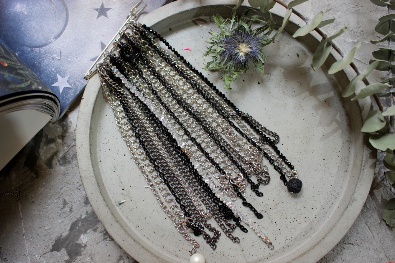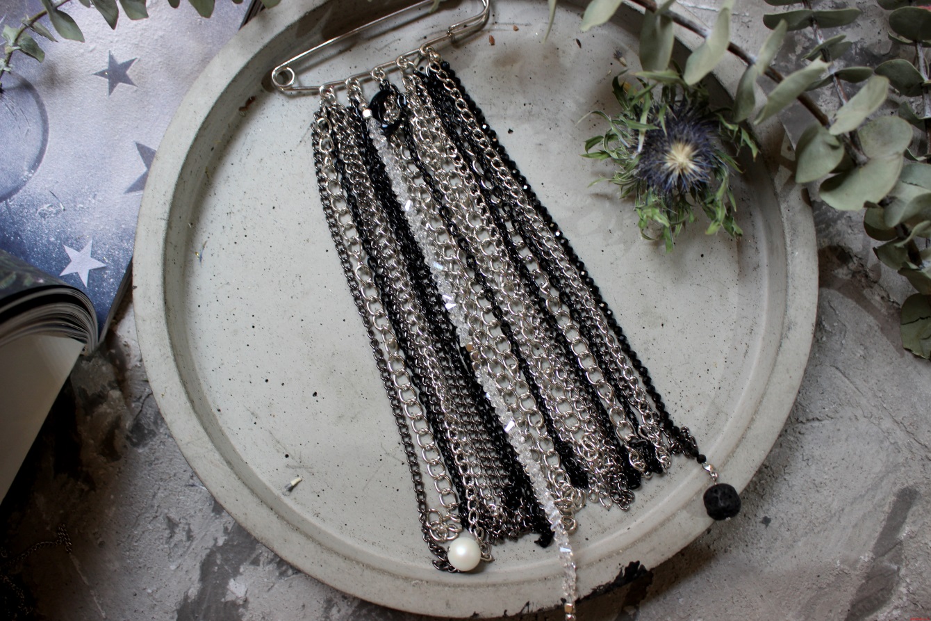 Булавка «Чёрная луна» с бусинами из майорки и лавы, цепями из циркона, алмазной крошки и бижутерного сплава MOONA