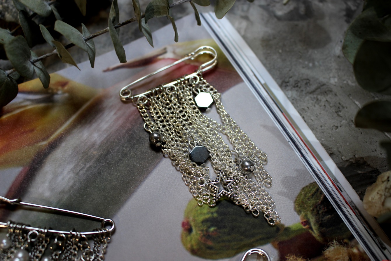 Булавка выполнена из бижутерного сплава с цепями из латуни и бусинами из гематита;