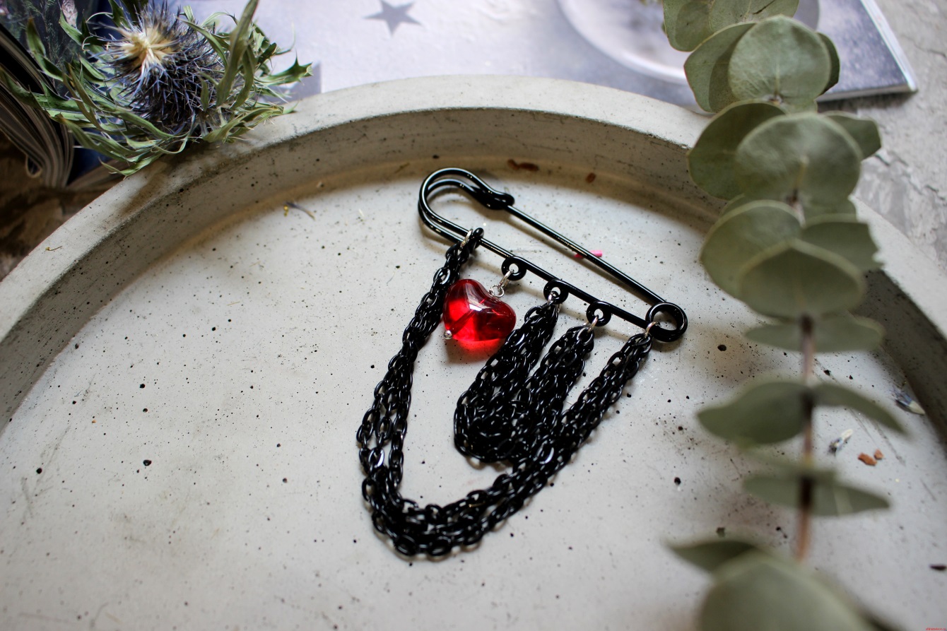 Булавка выполнена из бижутерного сплава и бусинами из майорки;