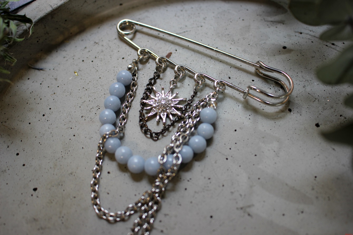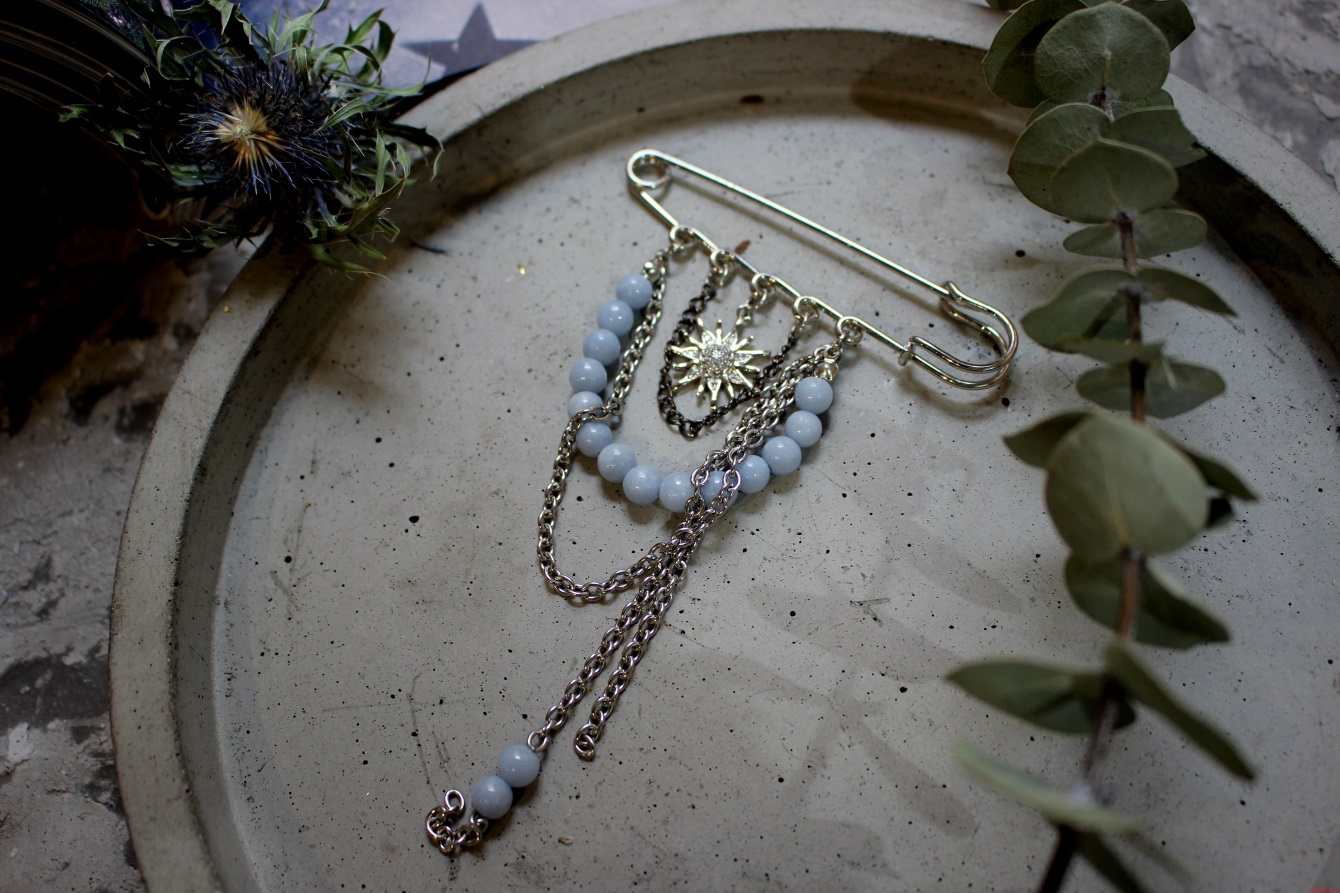 Булавка выполнена из бусин натурального ангелита, бижутерного сплава и фианитов;