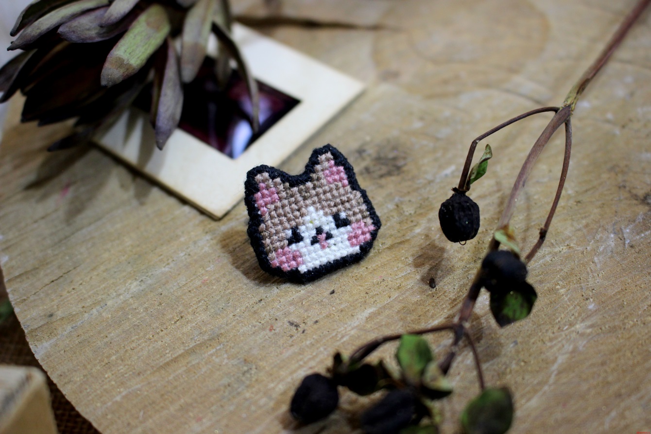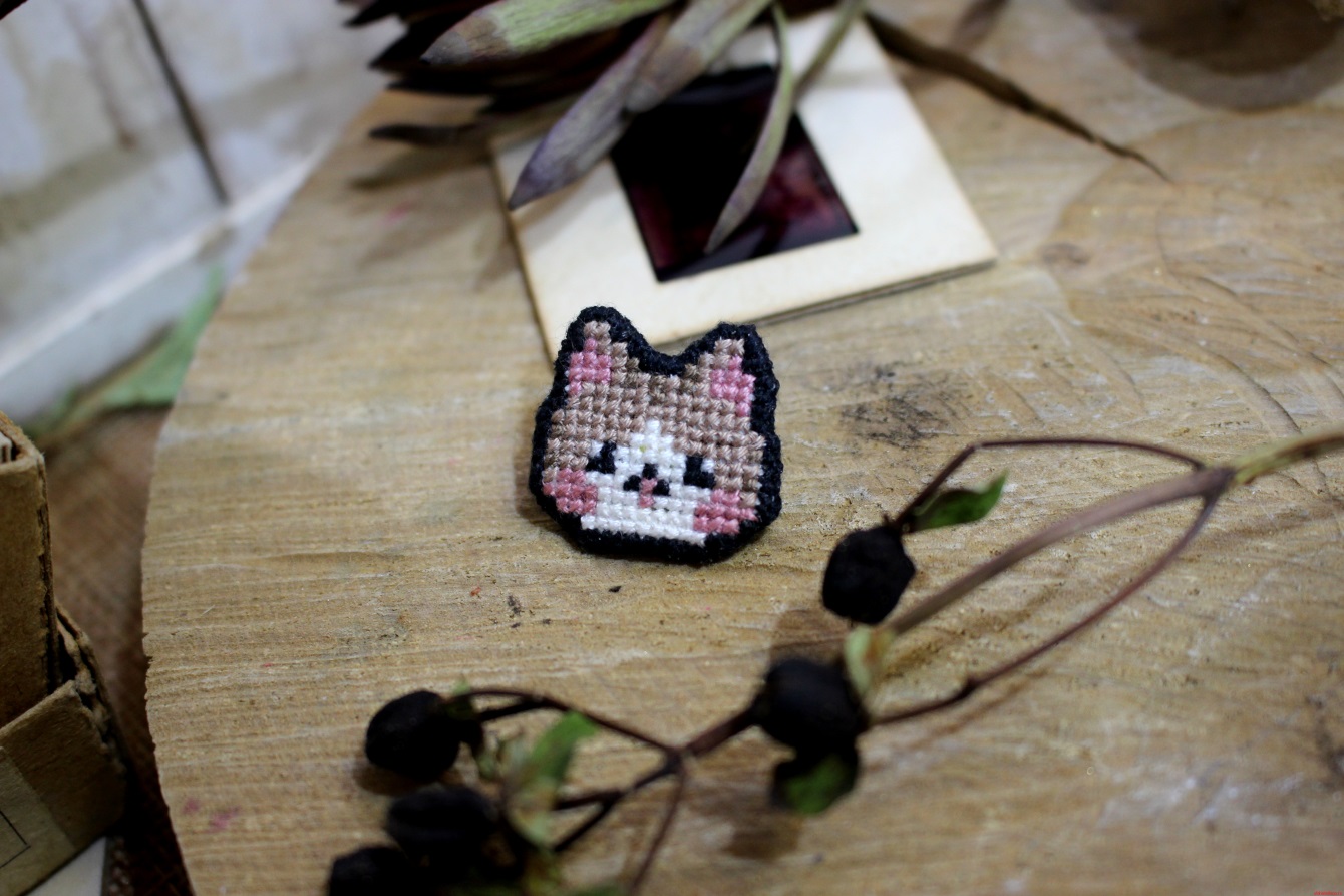 Пин «Разноцветный котик» (бежевый) с вышивкой в ассортименте Threadpunk