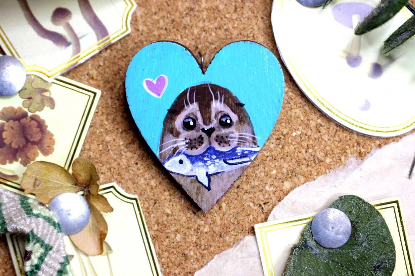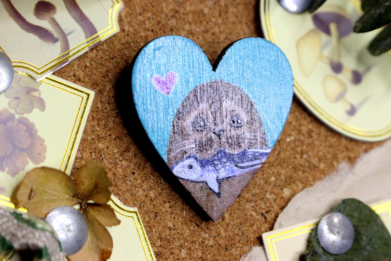 Деревянная брошка «Тюлень с рыбкой» сердечко, Nope Jam