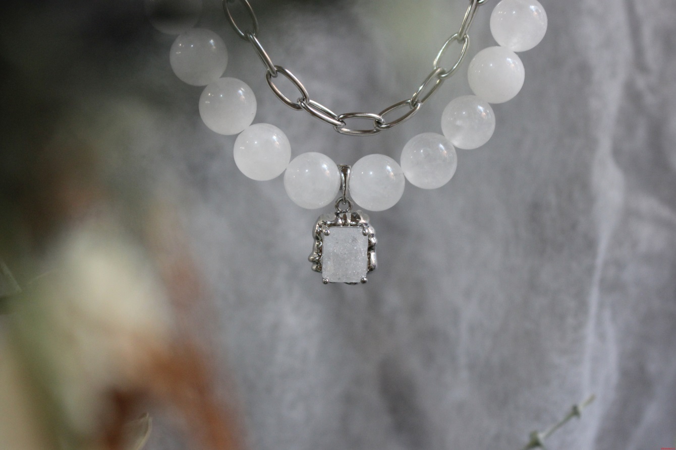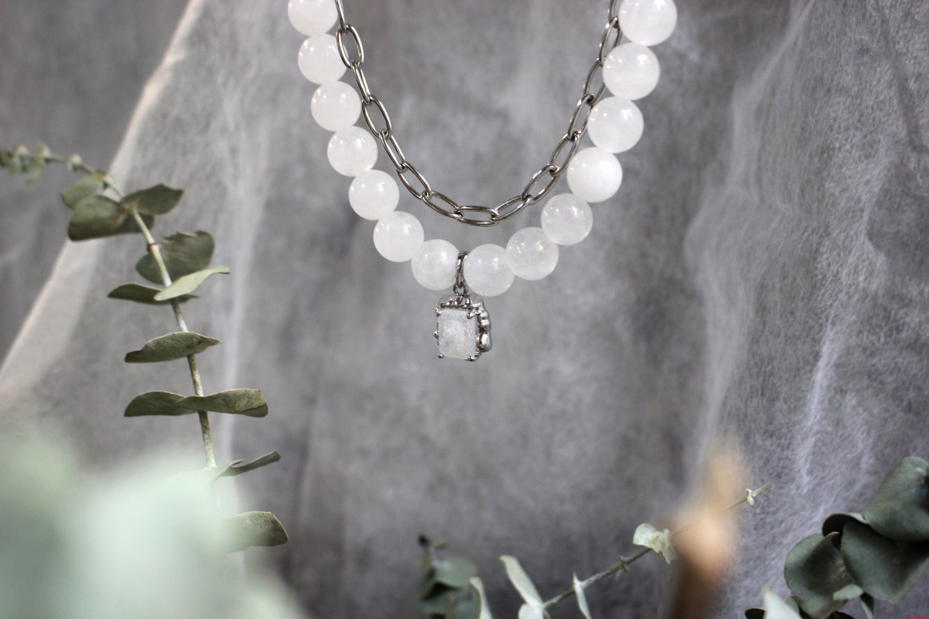 Колье из белого кварца, с квадратной вставкой из стекла и бижутерной цепью MOONA