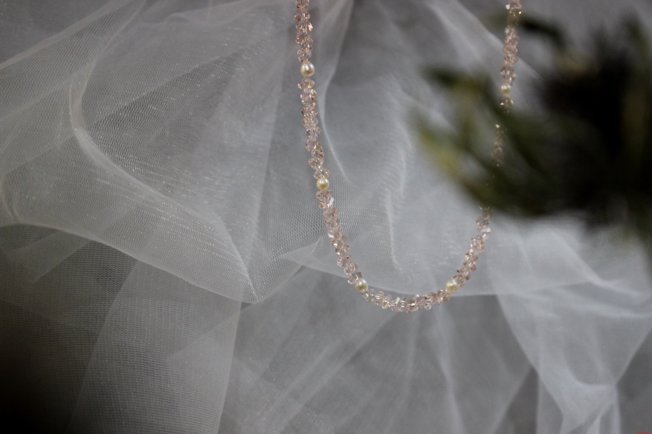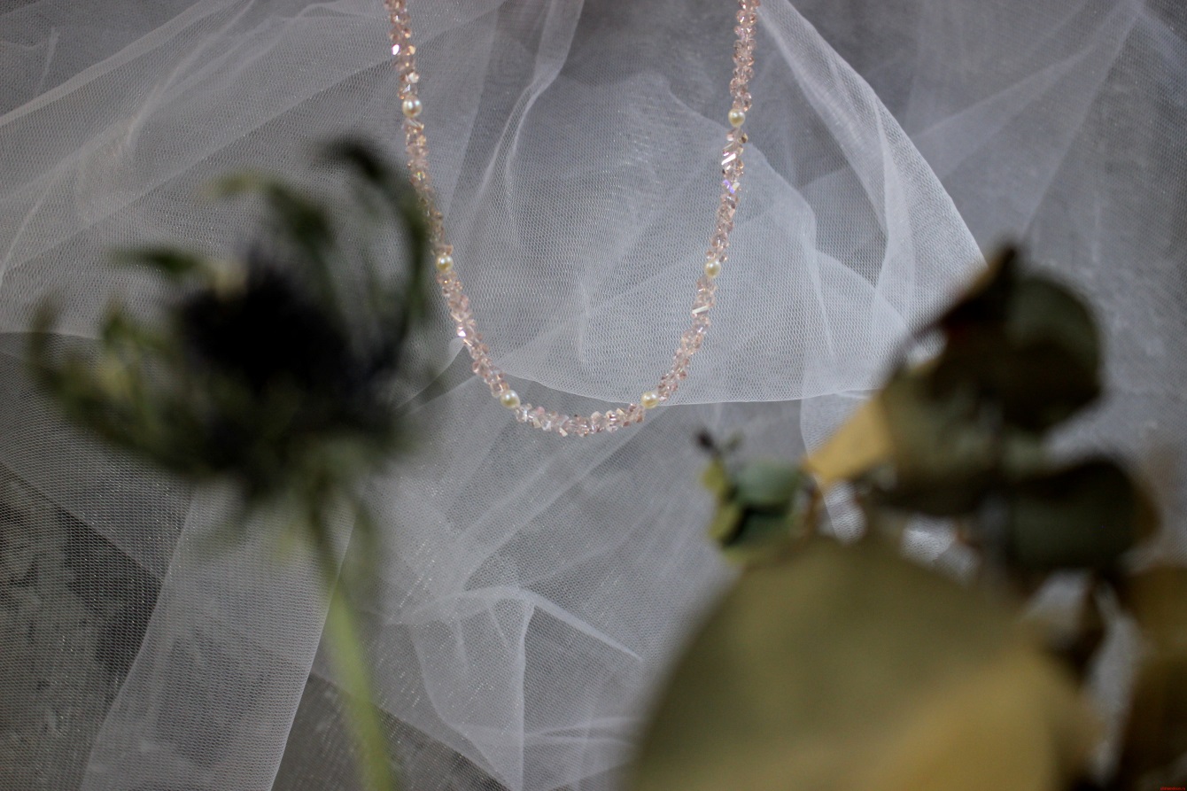 Колье из алмазной крошки и натурального жемчуга; Фурнитура: бижутерный сплав; Длина изделия: ~ 20 см