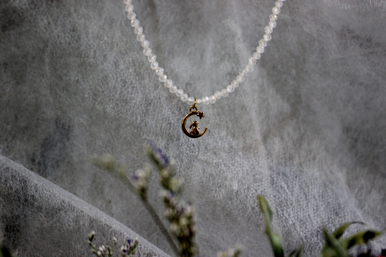 Колье выполнено из натурального циркона; Кулон зайчик выполнен из латуни, покрытой золотом 14к; Фурнитура: бижутерный сплав; Длина изделия: ~ 25 см