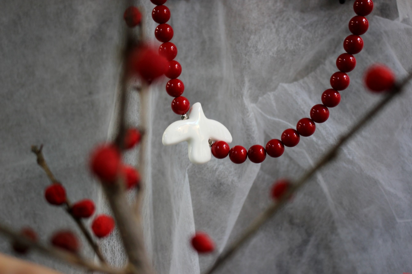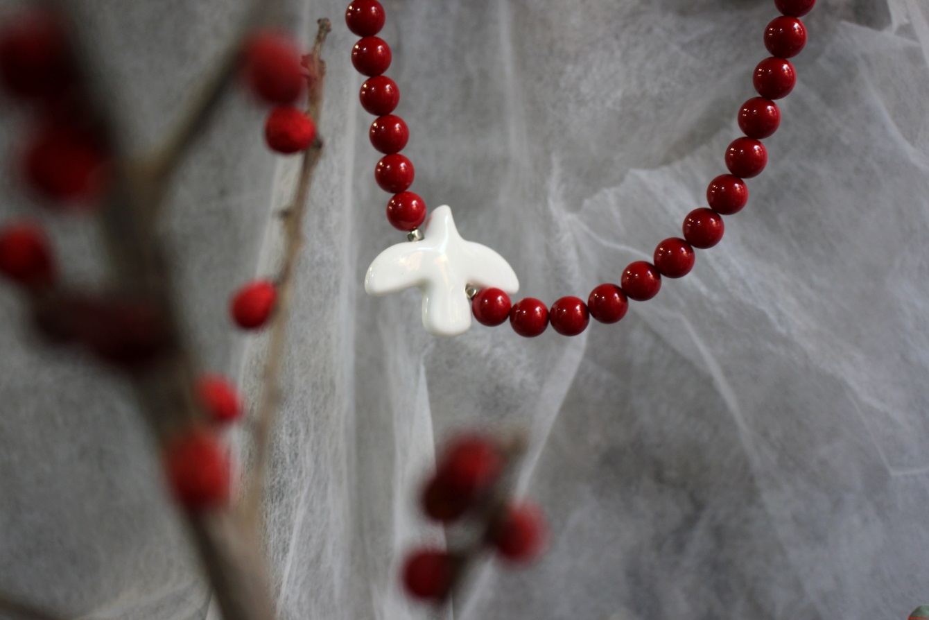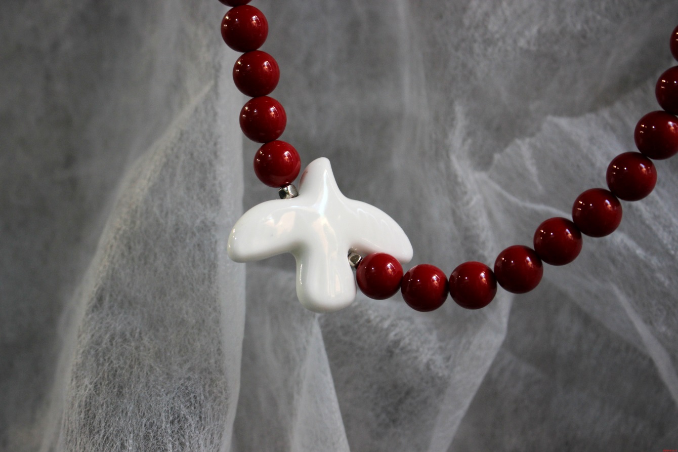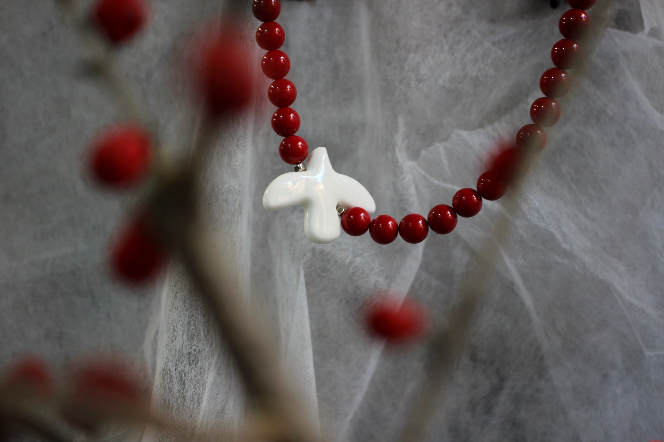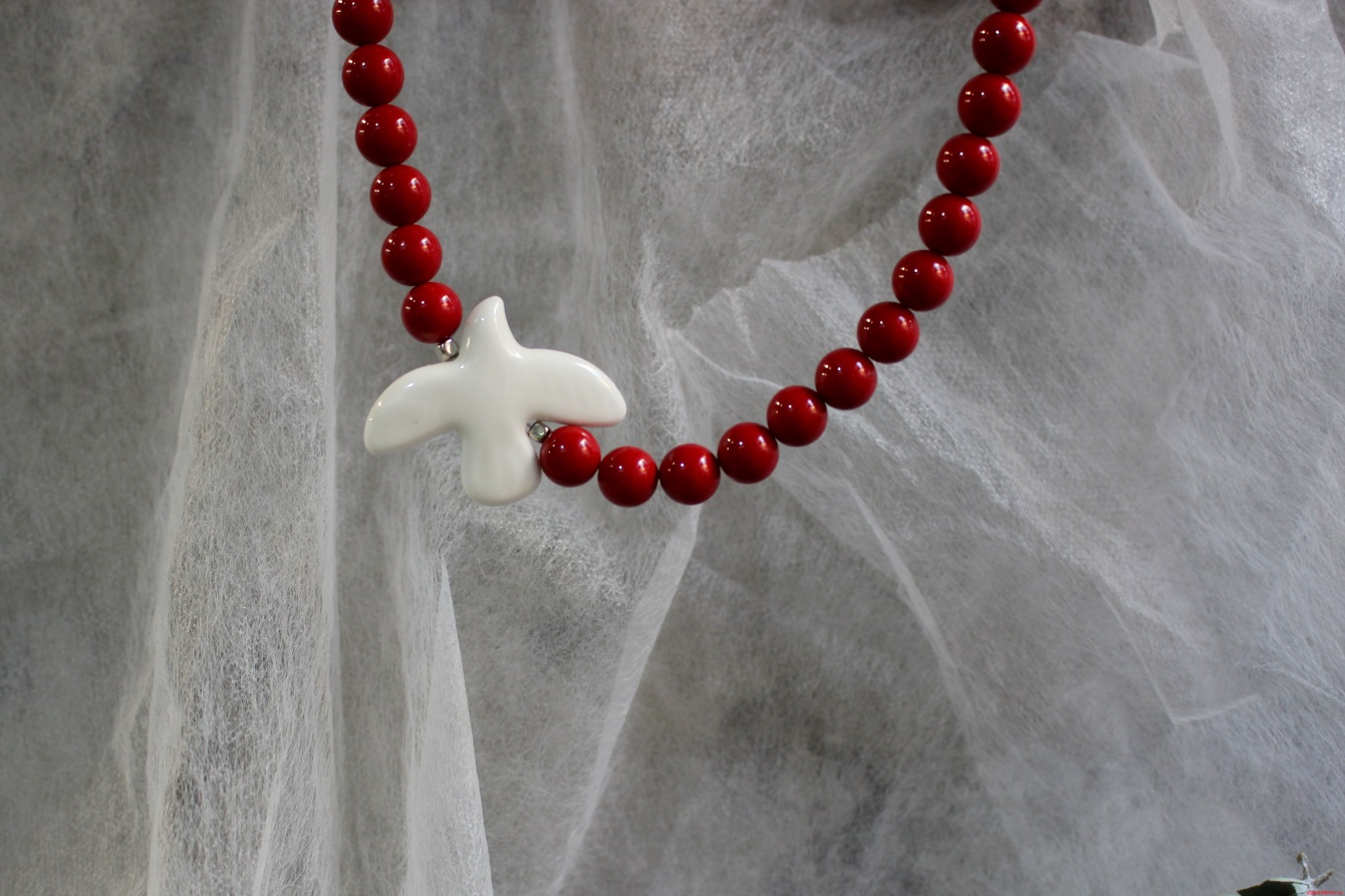 Колье выполнено из майорки; Бусина «Птица» выполнена из керамики; Фурнитура: бижутерный сплав; Длина изделия: ~ 26 см