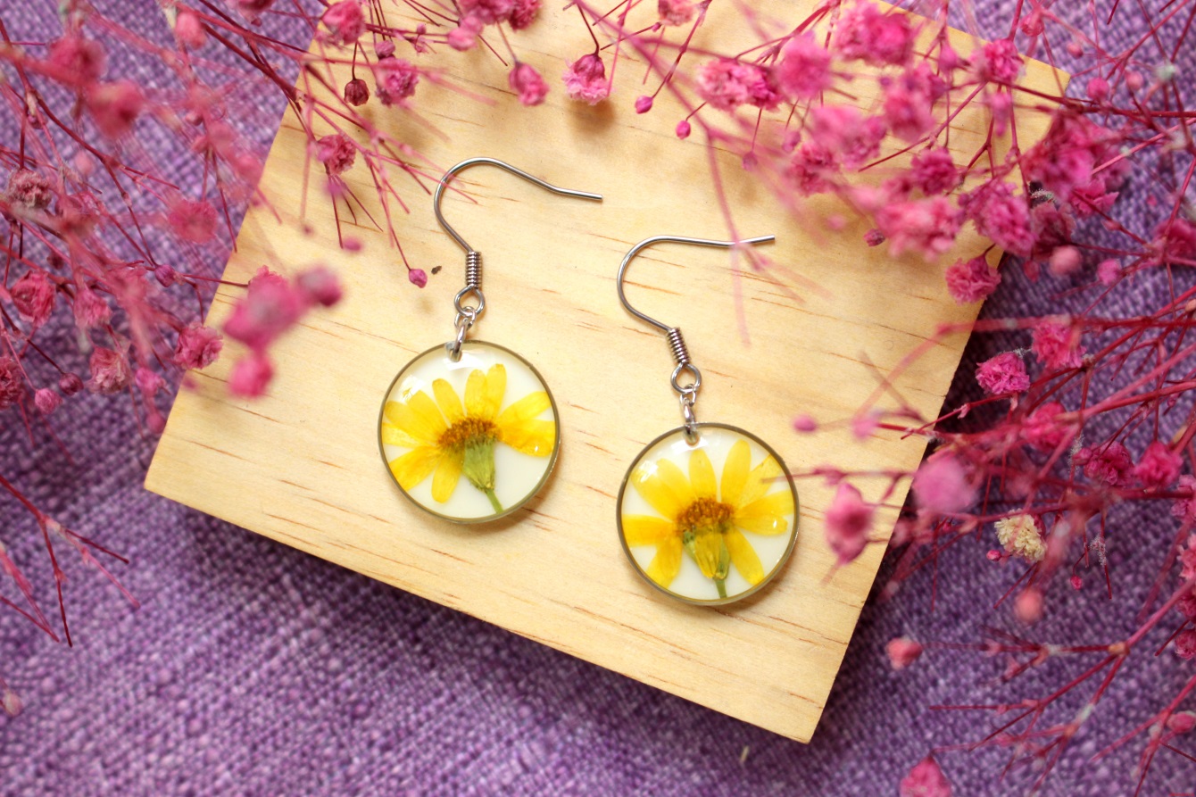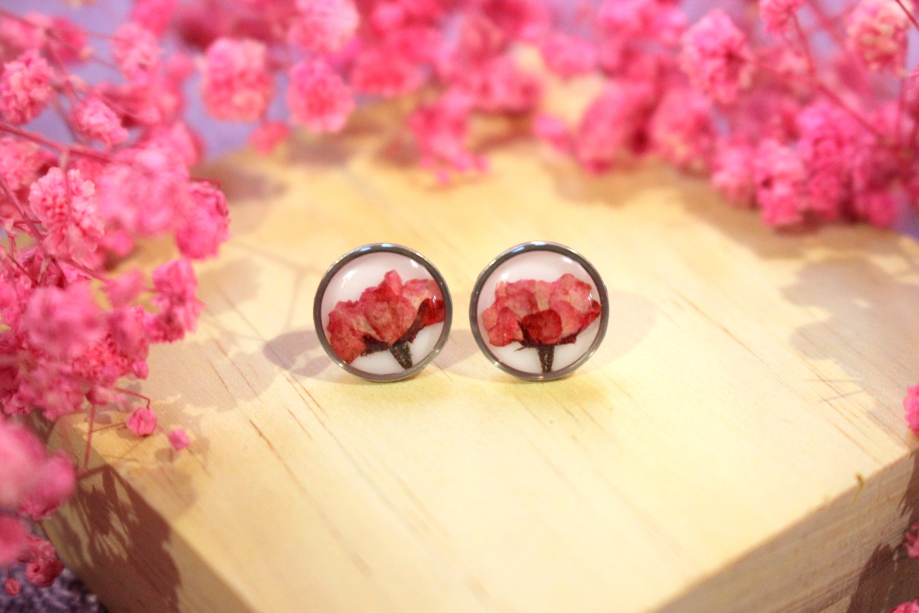 Серьги-гвоздики белые капли с красными сухоцветами (без каймы)