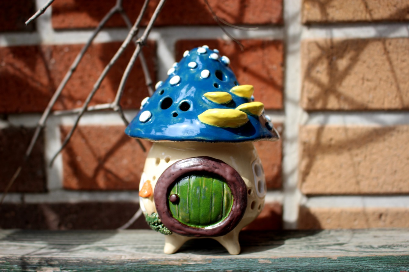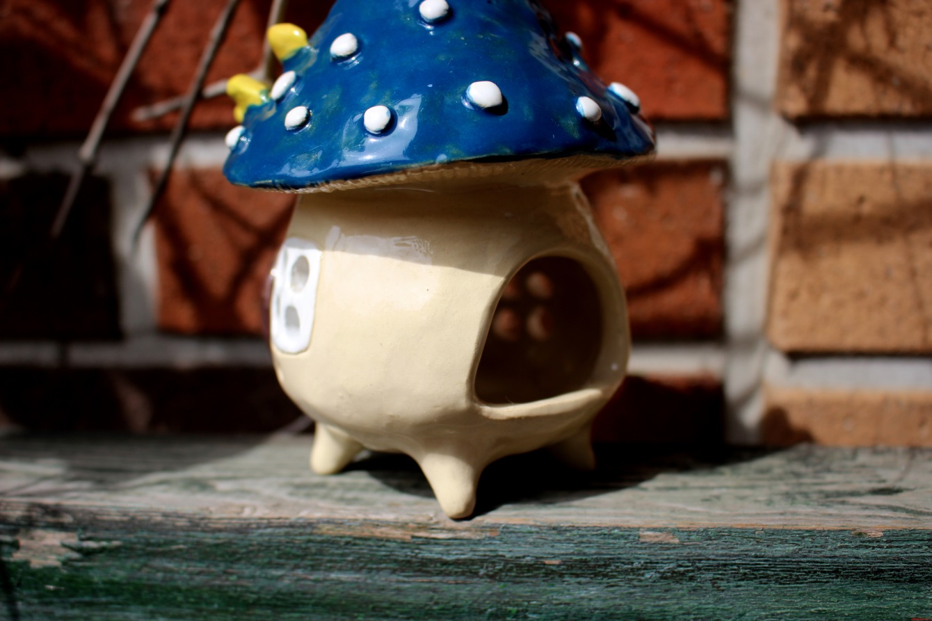 Подсвечник в виде домика-гриба с синей шапочкой из керамики Размер: ~ 13 см Керамические изделия сделаны в мастерской из Владивостока