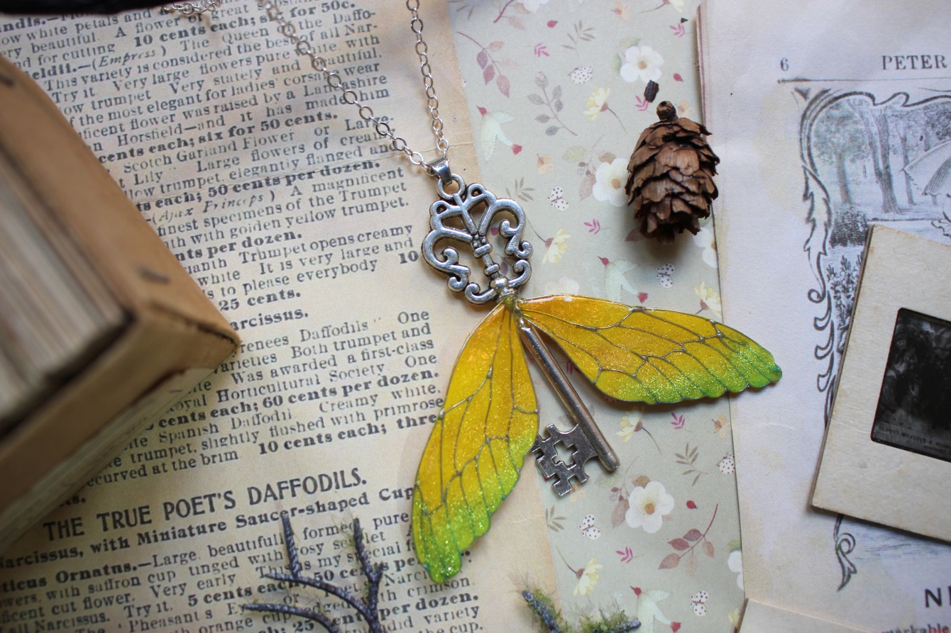 Подвеска «Ключ» жёлтая с двумя крыльями в технике витраль