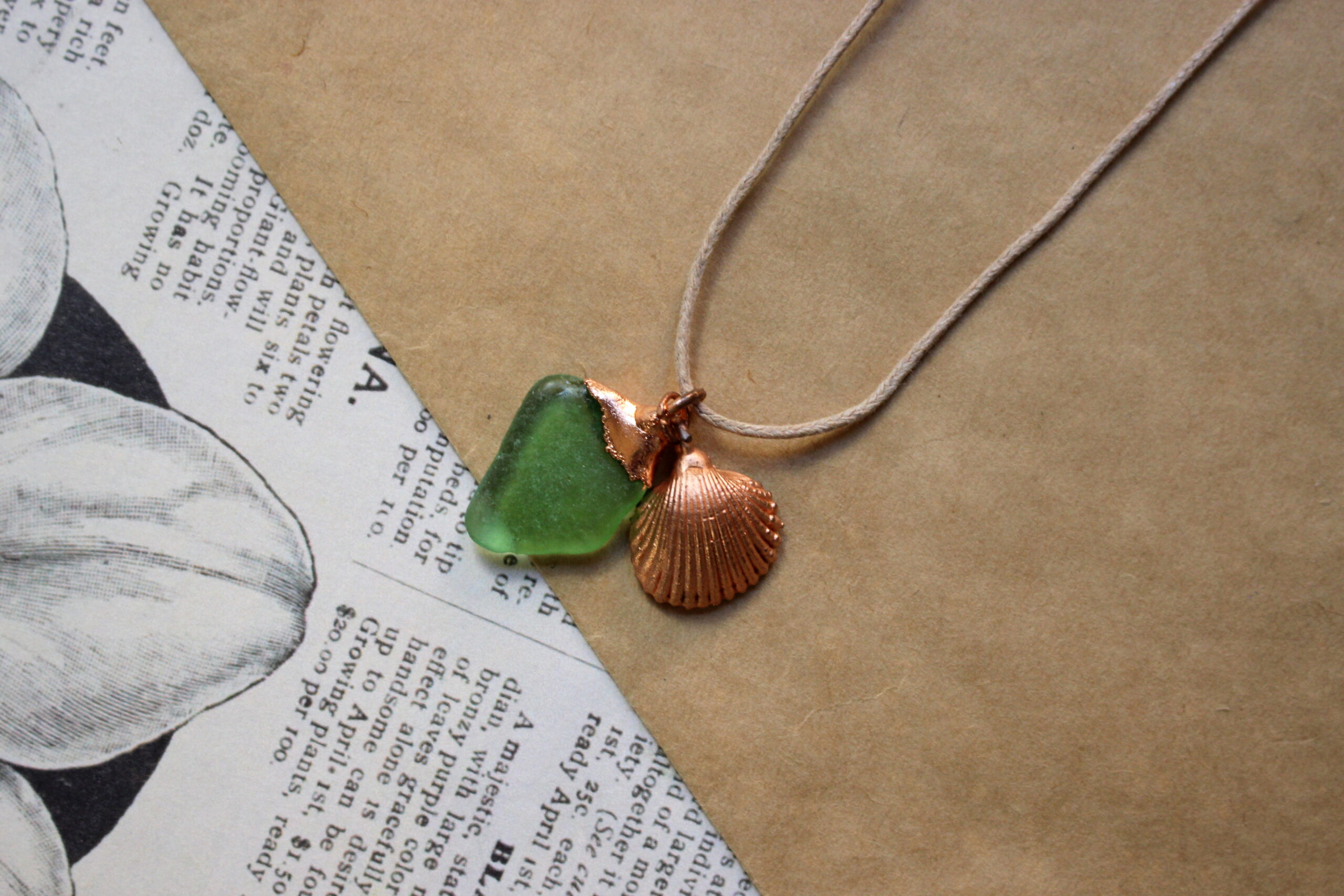 Материалы: ракушка, медь морское стекло.