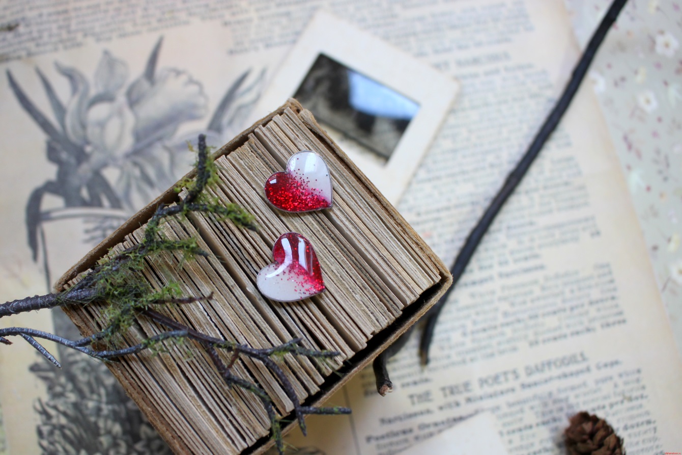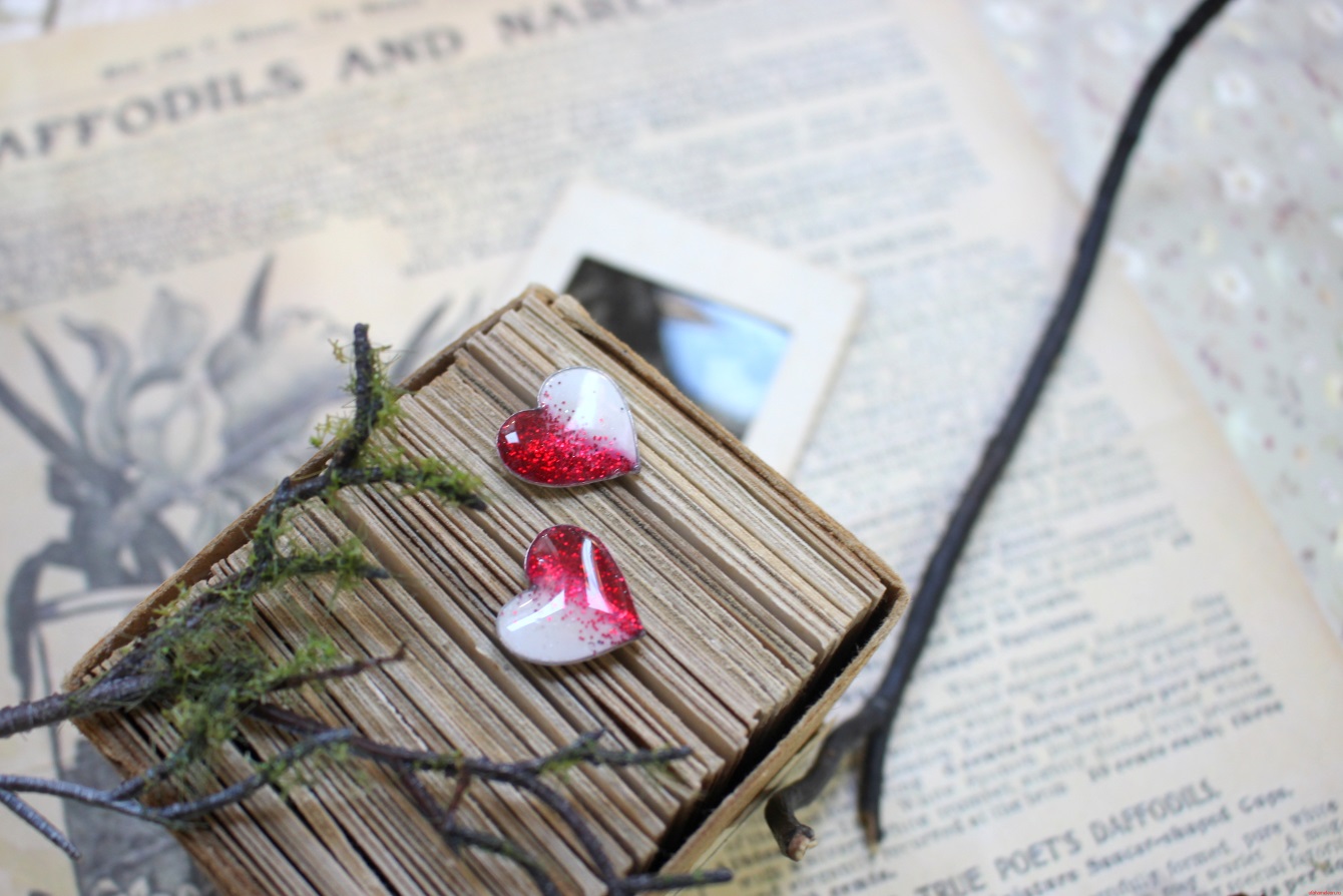 Серьги-гвоздики «Сердечко» красно-белое с блёстками из витрали