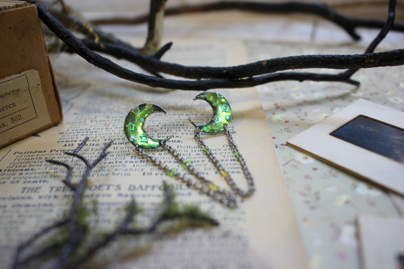 Серьги «Полумесяцы» с подвесками зелёные из витрали